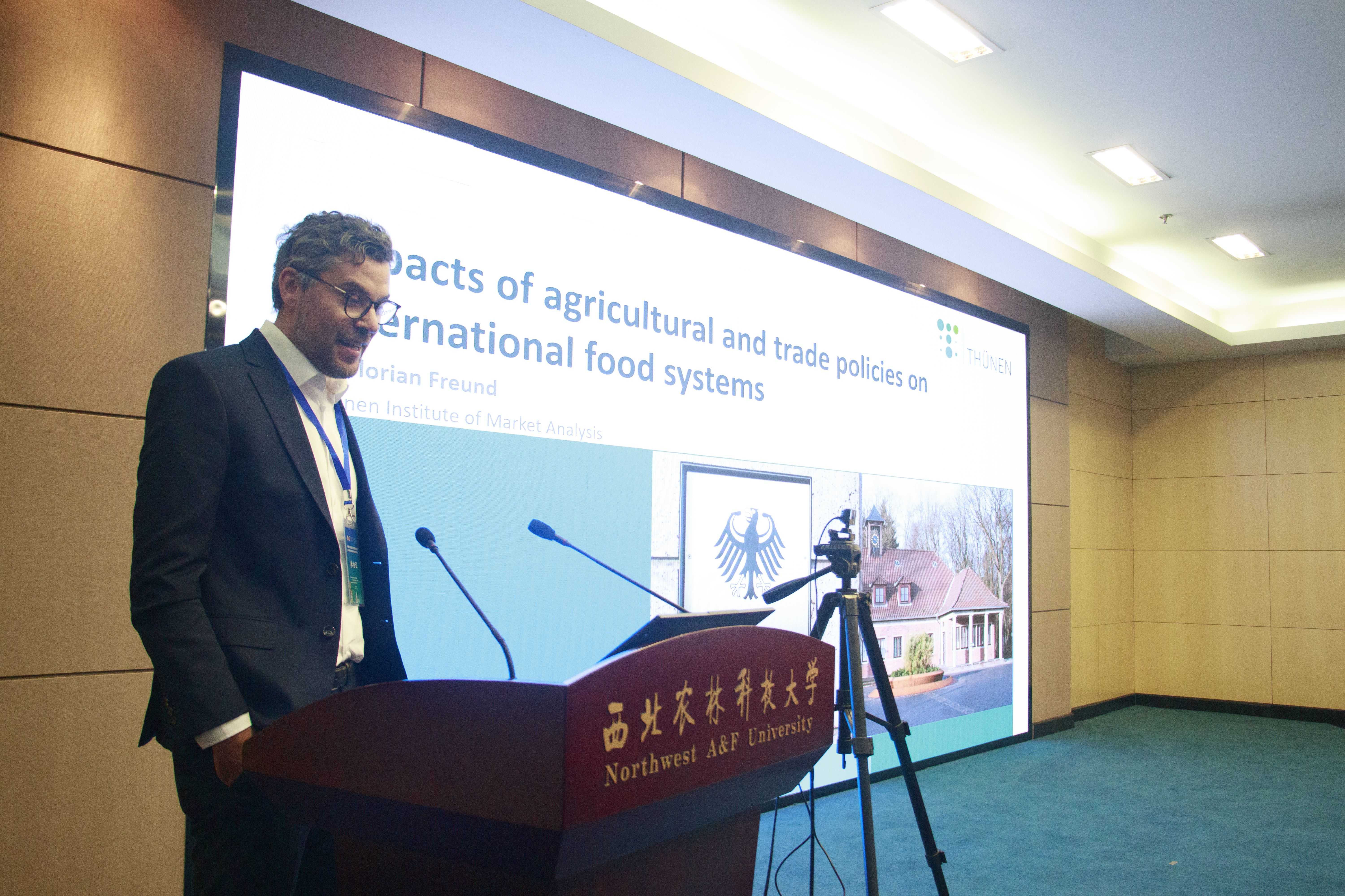 Florian Freund研究员以“Impacts of Agricultural and Trade Policies on International Food Systems”为题做主旨报告。Florian Freund研究员运用经济结构模型,对国际食物系统展开了研究,对英国脱欧、农业政策、国际贸易政策等对农业农民的影响展开了研究,并认为健康食物的贸易、国际形势的平稳都会对国际食物系统产生良好的影响。