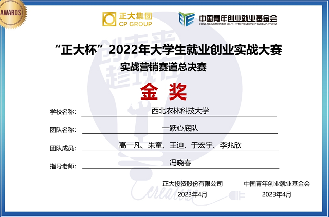 近日,由我院冯晓春老师指导的、我院2020级本科生高一凡等五名同学组成的“一跃心底”团队在2022年“正大杯”大学生就业创业实战大赛中,从全国433所院校的28000余人的团队中脱颖而出,最终荣获全国总决赛金奖。