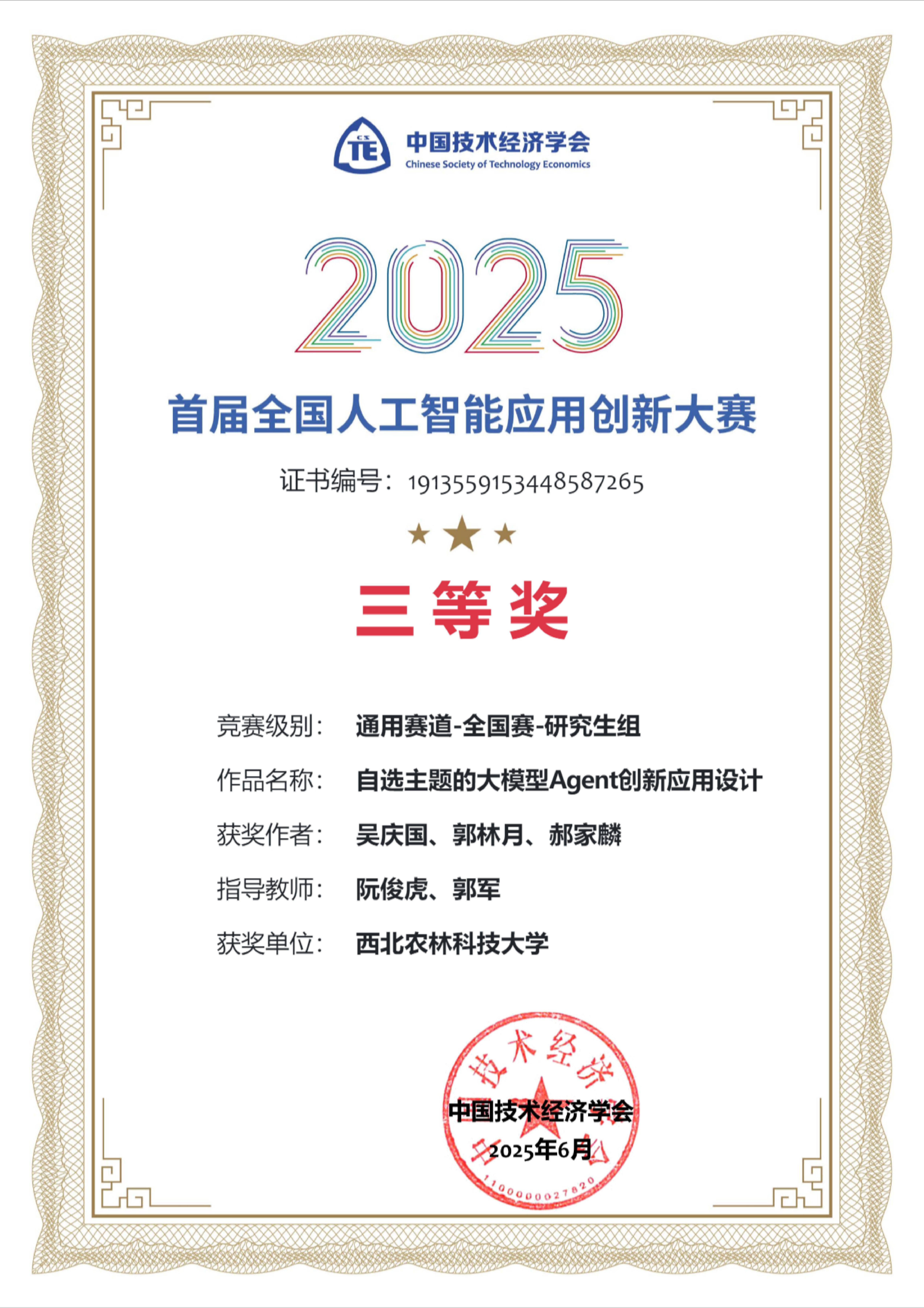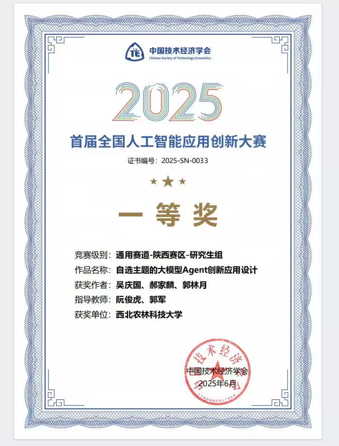 今年6月底,由中国技术经济学会主办的2025首届全国人工智能应用创新大赛圆满落幕。银河yh99阮俊虎教授与植物保护学院郭军教授共同指导的研究生团队(队长:吴庆国,队员:郝家麟、郭林月),凭借《后稷农业大模型·御锈》项目,在激烈竞争中脱颖而出,一举斩获通用赛道研究生组陕西省一等奖与全国总决赛三等奖,彰显了团队在人工智能应用领域的探索能力与创新水平。