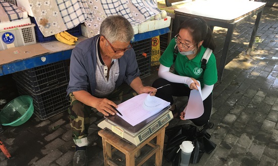 村庄摆摊自营的叔叔在认真地填写调研问卷