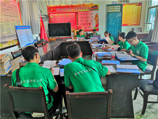 上午9点,调研队来到申东村村委会。为得到准确的贫困户信息,了解该村扶贫工作,为接下来的调研做好充分准备,在村干部的协助下,调研队全体成员在办公室翻阅贫困户资料,记录重要信息,并帮助村委会完成80余户贫困户的信息录入工作。在此过程中,申东村村委会工作人员热情招待,耐心讲解,给队员们的调研活动增添了很多便利,也增强了队员们在调研中坚持奋斗、再接再厉的信心与决心。