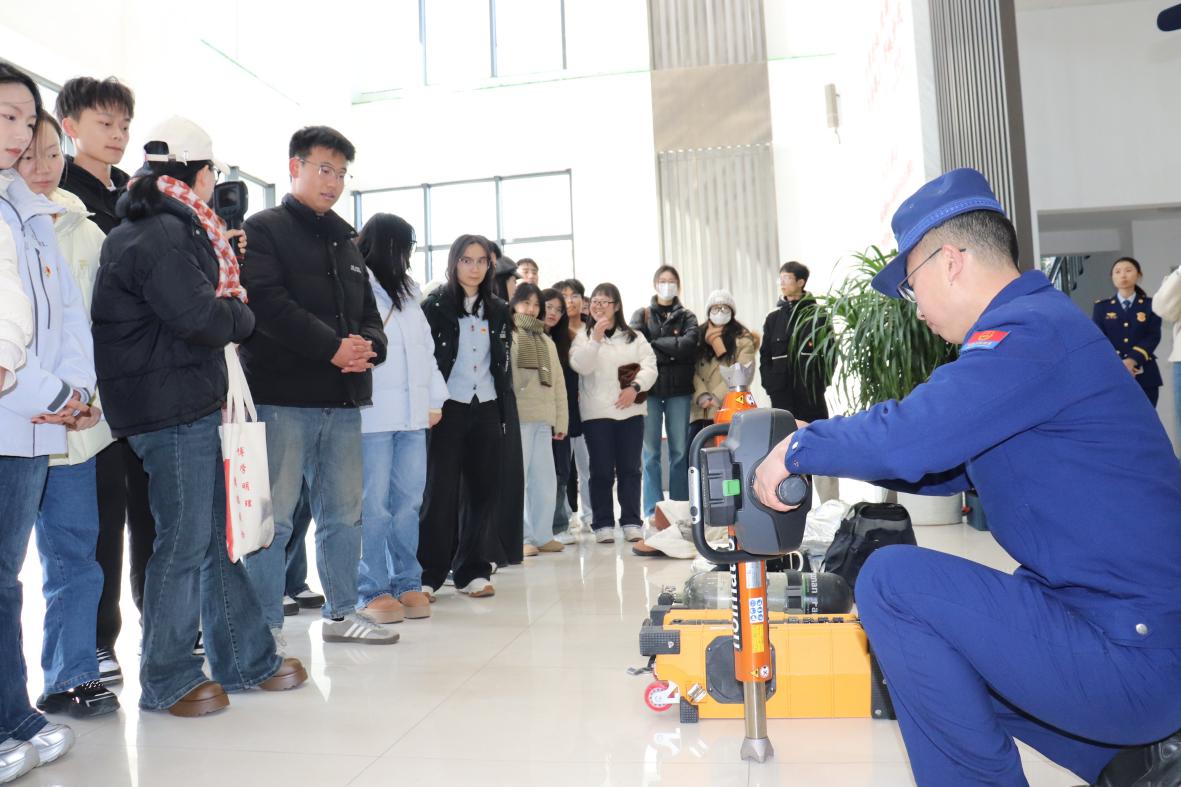 理论学习结束后,消防技能实训环节有序开展。在消防救援支队党员代表的专业指导下,研究生党员参观了抢险救援车、水罐消防车等特种车辆,详细了解破拆工具、空气呼吸器、热成像仪等专业器材的功能与使用方法,近距离观摩消防员专业技能演示,亲身参与使用专业消防设备、灭火器实操、消防水带连接等基础技能训练,实操能力与应急反应能力得到显著提升。